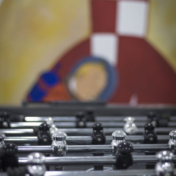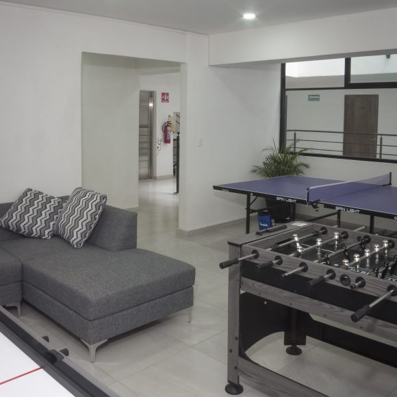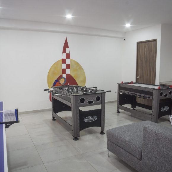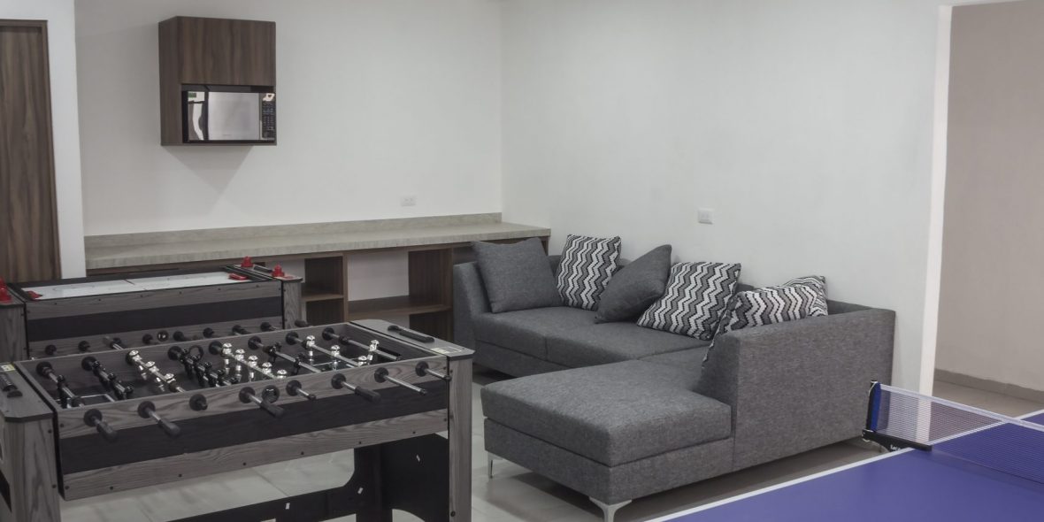 Cuenta con mesa de futbolito, mesa de hockey, mesa de ping pong, microondas y un sofá para descansar.