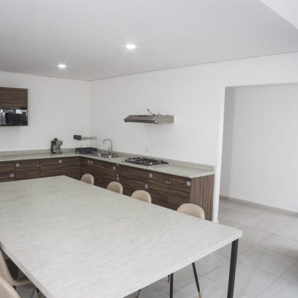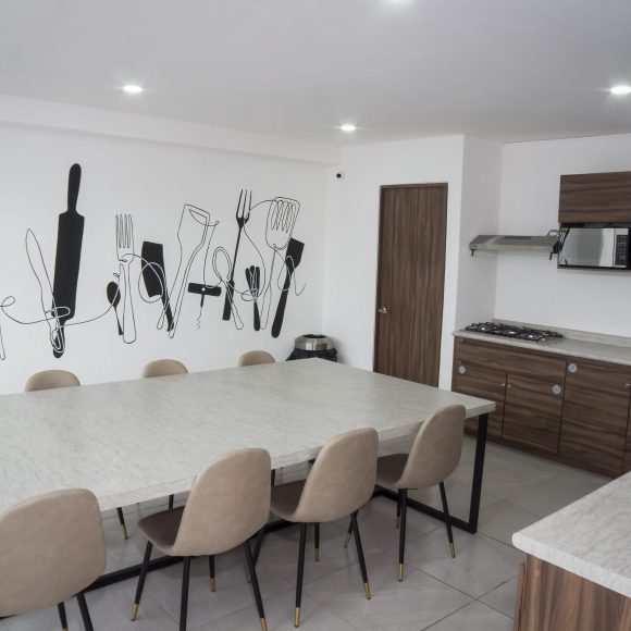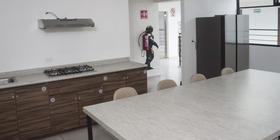 Se cuenta con 2 cocinas equipadas con parrillas de 4 quemadores, extractor de humo y olores, microondas, botes para basura, gabinetes con llave para cada residente, refrigerador, congelador y comedor amplio.