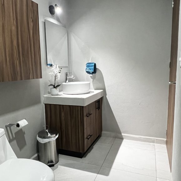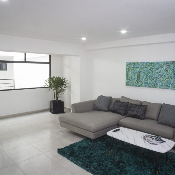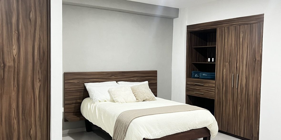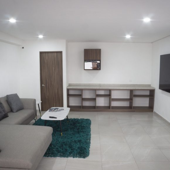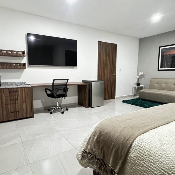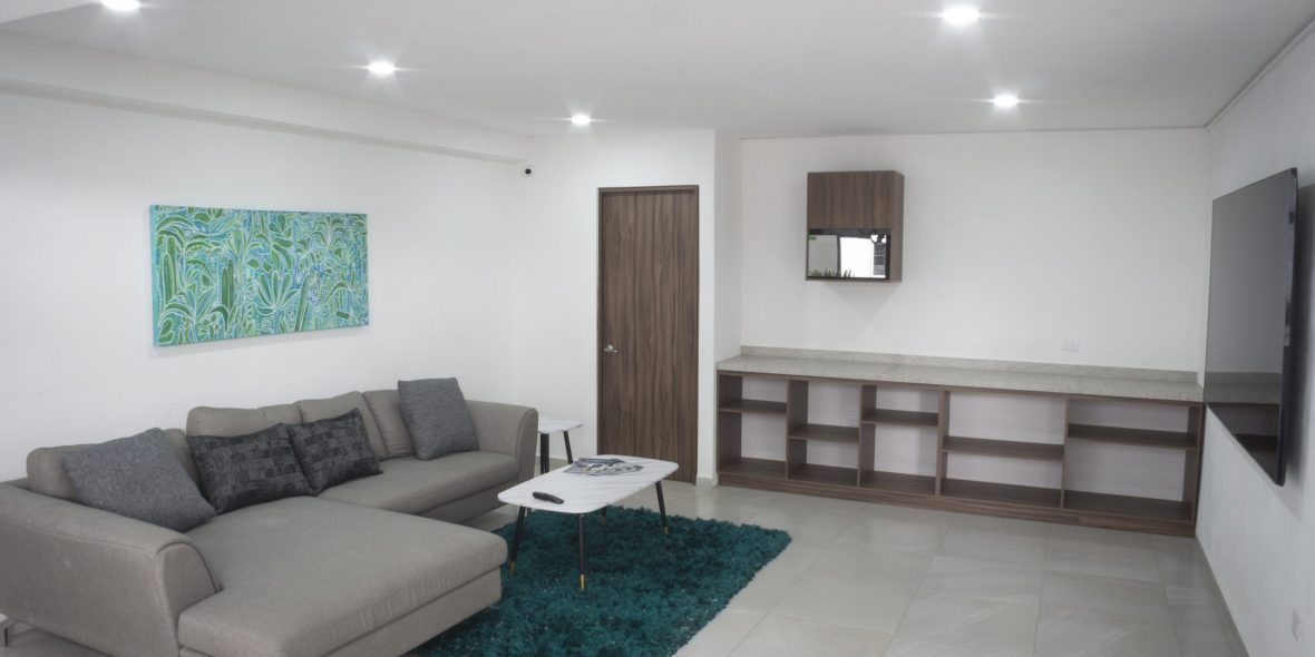 Cuenta con un sofá amplio y cómodo, barra para alimentos y bebidas, microondas y pantalla con servicios de streaming.